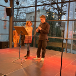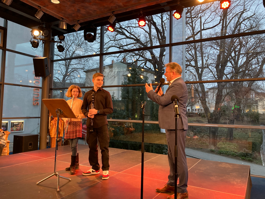 Zwei Geschwister eröffneten die Veranstaltung stimmungsvoll mit einem Stück für Querflöte und Klarinette. Der Oberbürgermeister Herr Wendsche kündigte den Beitrag herzlich an und kam mit den jungen Musikern wertschätzend ins Gespräch.
