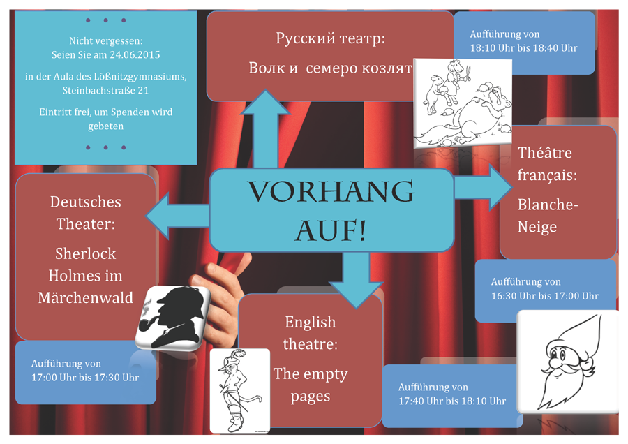 Vom 15.06.2015 bis zum 24.06.15 haben die Sechstklässler des Lößnitzgymnasiums Fächer verbindenden Unterricht. Es gibt 4 Theatergruppen, die Deutsch-, Englisch-, Russisch- und die Französischgruppe (die Namen verraten die Sprache, in der gespielt wird). Die Deutschgruppe spielt „Sherlock Holmes im Märchenwald“, die Russischgruppe „Der Wolf und die 7 Geißlein“, die Englischgruppe…