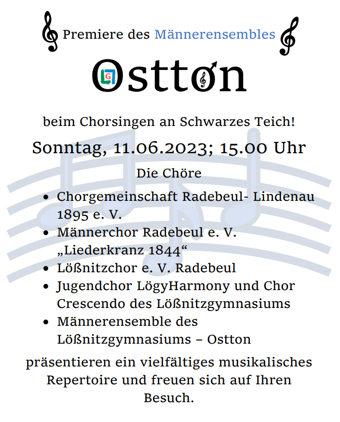 Achtung, Achtung! Kommenden Sonntag findet wieder das wunderbare Chorsingen an Schwarzes Teich statt. Und das Lößnitzgymnasium ist erstmalig mit zwei Ensembles dabei: dem Jugendchor LögyHarmony vereint mit Chor Crescendo und dem neu gegründeten Männerensemble Ostton. Lasst euch die Chance nicht entgehen! Chorsingen an Schwarzes Teich im Waldpark Radebeul West. Sonntag, 11. Juni um 15 Uhr. Bringt euch eine Sitzgelegenheit mit. Wir freuen uns sehr auf euch!