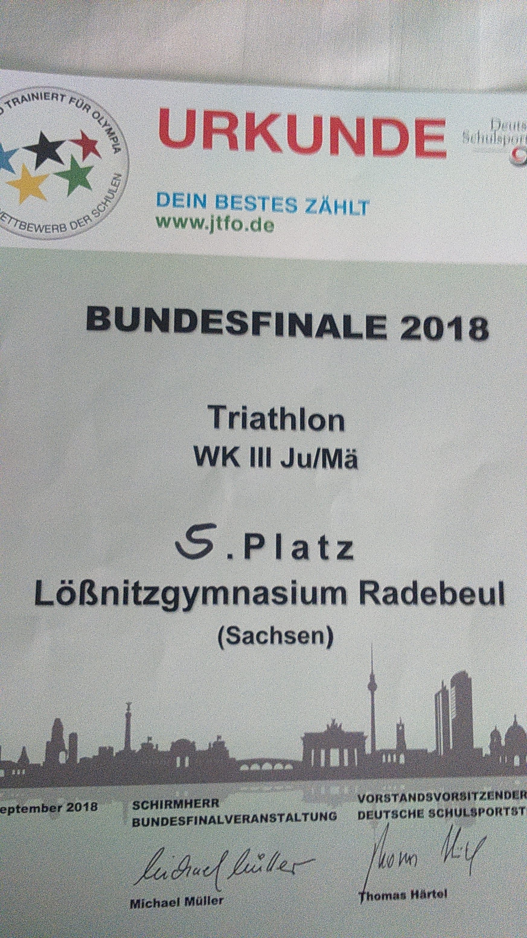 Wenn Lögianer (Clara Nitschmann, Luise Dammann, Elisa Keller, Johanna Taubert, Finn Eschler, Aaron Hardner, Paul Ubbelohde und Lennox Fechtner) an ihre Leistungsgrenzen gehen, dann erreicht man ungeahnte Platzierungen. Habe ich in meinem Kollegenkreis vor einem Jahr behauptet, dass ein Bundesfinale für eine „Nichtsportschule“ eine absolute Ausnahme ist, dann werde ich nun von dem Traum der Schüler getragen, es im nächsten Jahr zur dritten Teilnahme wieder nach Berlin zu schaffen. Den Stadtplan von Berlin, mit einigen U- und S-Bahnverbindungen, hebe ich mir diesmal auf.