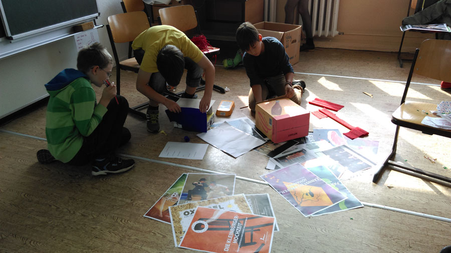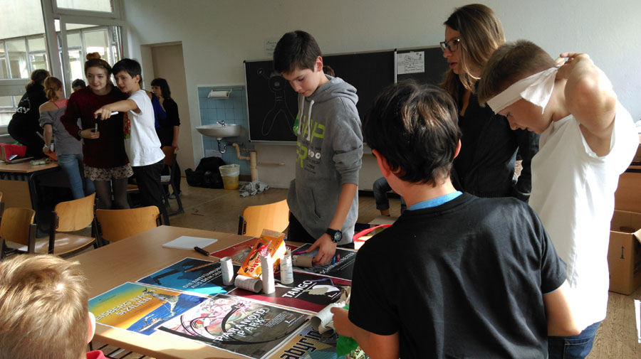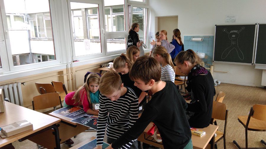 Am Freitag, den 11.09.2015 verbrachten meine Klasse und ich vier gemeinsame Stunden zusammen mit Schauspielern der Landesbühnen Sachsen. Ort unseres Treffens war unser Freiarbeitszimmer, denn dort hatten wir genügend Platz. Anfangs richteten wir das Zimmer gemütlich ein. Als das geschafft war, suchte sich jeder einen schönen Platz. Alle hatten unterschiedliche Kärtchen erhalten, darauf stand z.B.: „Wenn ich nicht ich wäre, wäre ich…“ oder „Wenn ich eine Zahl wäre, wäre ich…“. Jeder sollte seinen Satz mündlich beenden. Als diese Aufgabenstellung gelöst war, wartete schon die Zweite auf uns. Man sollte das Zimmer genau anschauen und einprägen. Überall waren Fragezettel verteilt. Darauf stand z.B. „Wohin führt der unterirdische Gang in meinem Zimmer?“. Das sollte jeder für sich selbst beantworten. Danach wurden unsere Augen verbunden und es war wichtig, an das Zimmer zu denken. Wir sollten das Zimmer „fühlen“. Da man nichts sah, stieß man hin und wieder mit seinen Mitschülern zusammen. Außerdem bekam man Dinge in die Hände, welche man ertasten musste. In einem Kreis redeten wir dann darüber, was wir fühlten. Als nächstes sollten wir Fragen stellen, etwa solche: „Kann man in die Vergangenheit reisen?“. Wir sollten uns dann in Gruppen zusammen finden und die beste Frage wählen. Später musste jede Gruppe eine kleine Vorstellung geben. Manche hielten einen Dialog, andere eine Talkshow. Die letzte Aufgabe bestand darin, zusammen ein kleines Theater zu basteln um es anschließend ebenfalls zu präsentieren.