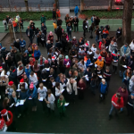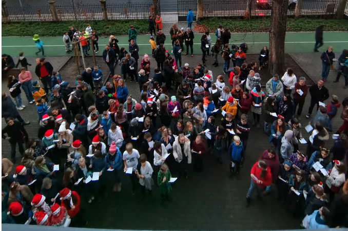 Zwei mutige Mitglieder des Bläser-Ensembles haben als Eröffnungsfanfare alle im Hof zusammengerufen. Zum Glück hat uns Frau Matthes die Liedtexte zur Verfügung gestellt, denn wir waren ein wenig eingerostet.