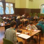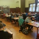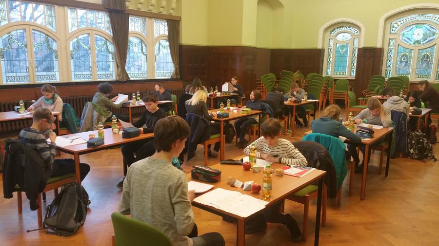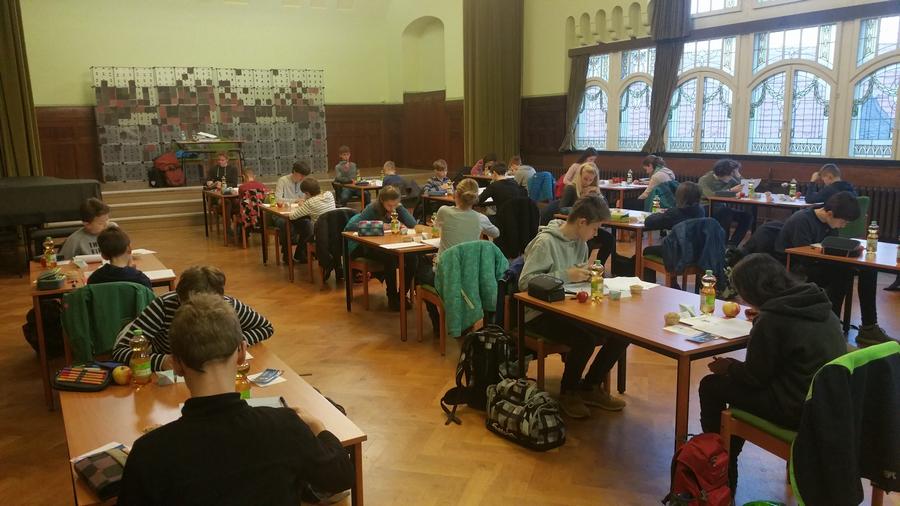 Kurz vor 8 begrüßte Herr Beirich die 31 Schüler zur 2. Stufe der Mathematikolympiade und es ging los, meist mit einer machbaren Aufgabe, die man jedoch trotzdem dreimal lesen musste, um halbwegs zu erkennen, wie man an die Lösung gehen kann. Die Konzentration war spürbar, nahezu hörbar und das über vier Stunden. Dabei ging es nicht, wie jeder meint, um das simple Lösen von Aufgaben. Nein, das erste Problem bestand darin, überhaupt zu erkennen, was gegeben und was gesucht ist. Bei der zweiten Aufgabe der 8. Klasse ging es um ein einfaches Dreieck, na gut, es war stumpfwinklig. Aber dann gab es da noch den Punkt E auf der Geraden durch A und C, welcher sich gleichzeitig auf dem Lot von B auf die eben genannte Gerade befinden sollte. Und dann noch F und S mit ähnlichen Bedingungen. Da war man noch nicht bei der Fragestellung. Es gelang nur einem Schüler, die Auftaktskizze richtig zu erstellen. Aber das war das schwerste Problem. Insgesamt haben alle Schüler Lösungen zu mindestens drei Aufgaben abgegeben. Das ist großartig.