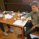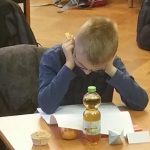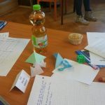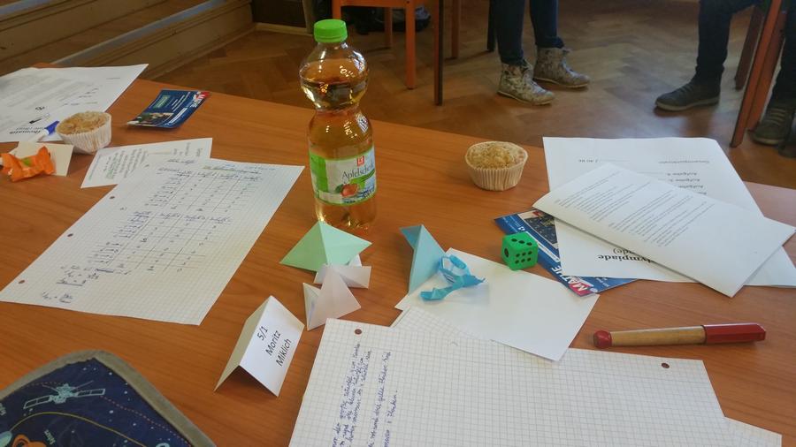 Um 7.30 Uhr war alles angerichtet. Die Tische waren perfekt geordnet um ausreichend Platz für Konzentration und Abstand zu den anderen Olympioniken zu gewährleisten (Danke an unsere Hausmeister). Für jeden Schüler gab es neben einem Block, einem Highlighter und einem Rätsel auch noch etwas Süßes, einen Muffin, ein Getränk sowie etwas Gebasteltes von … natürlich von Frau Schiller. Von ihr stammte auch die Idee mit dem Experiment zum Anfassen im Eingangsbereich der Schule. Danke dafür.