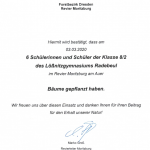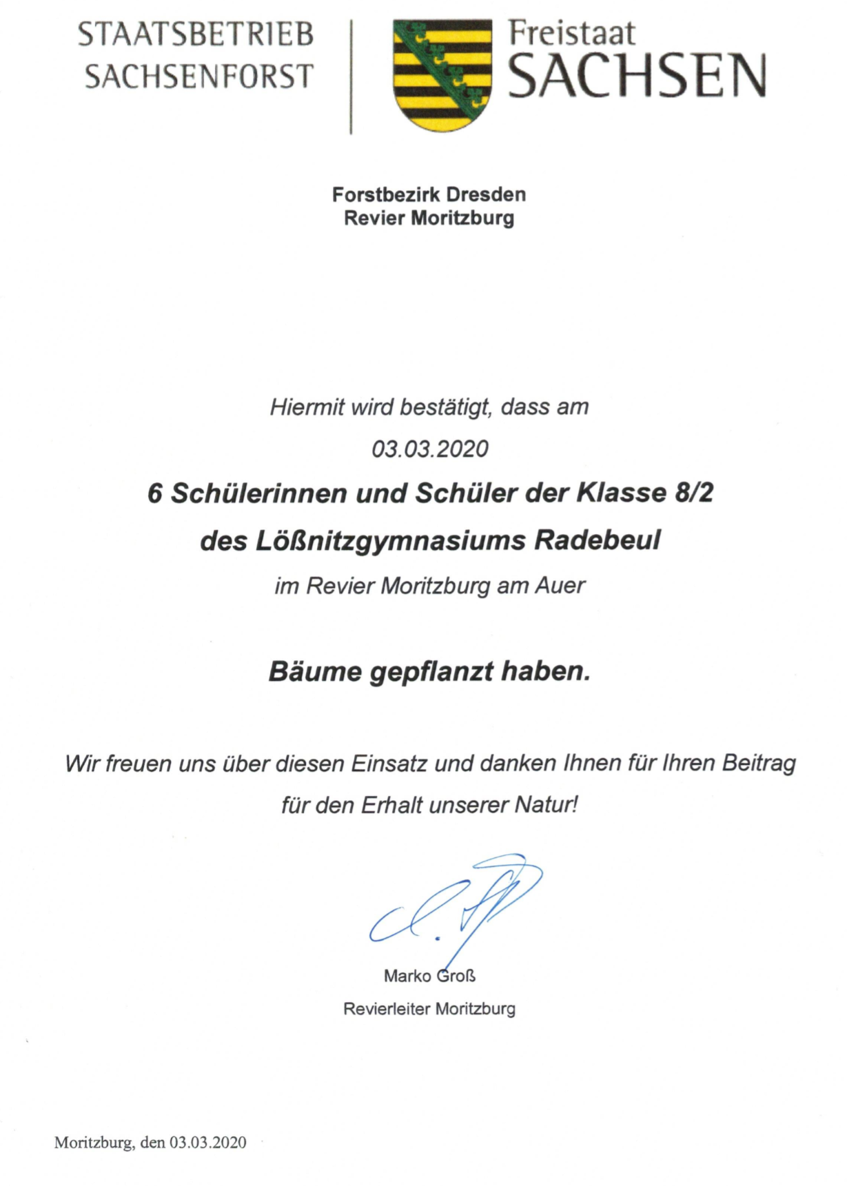 Anstatt auf die FridaysForFuture Demos zu gehen und zu demontieren, haben sich 5 Mädchen der Klasse 8/2 am 3. März ein Herz gefasst und was für die Umwelt gemacht. Sie fuhren kurz nach der Schule, unter der Leitung von Frau Beyer mit der Bahn nach Coswig und von da aus mit dem Bus zum Forsthaus Kreyern. Dort begrüßten uns drei freundliche Herren, die Förster, mit denen wir dann zur Pflanzfläche fuhren. Am Anfang erklärte uns einer der Männer, wie wir vorgehen sollten und dann ging es auch schon ans Werk.