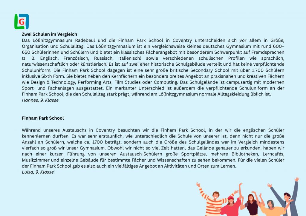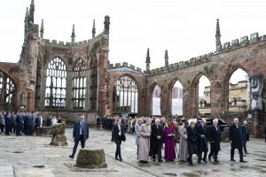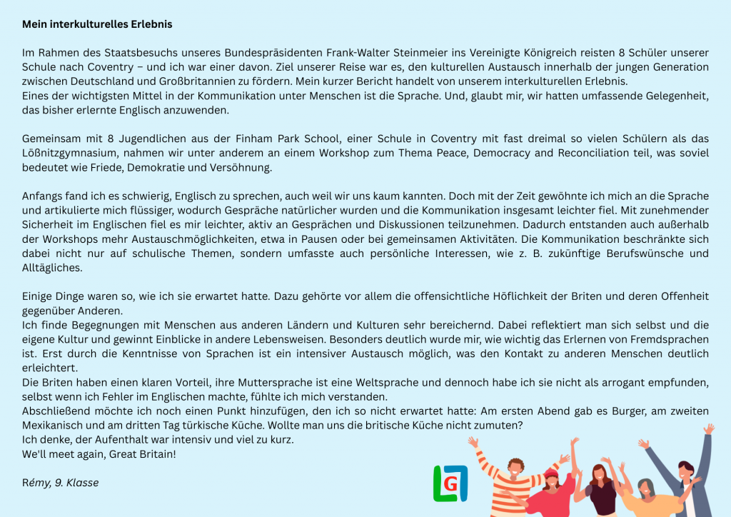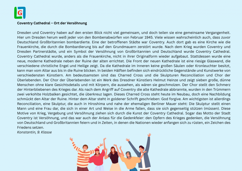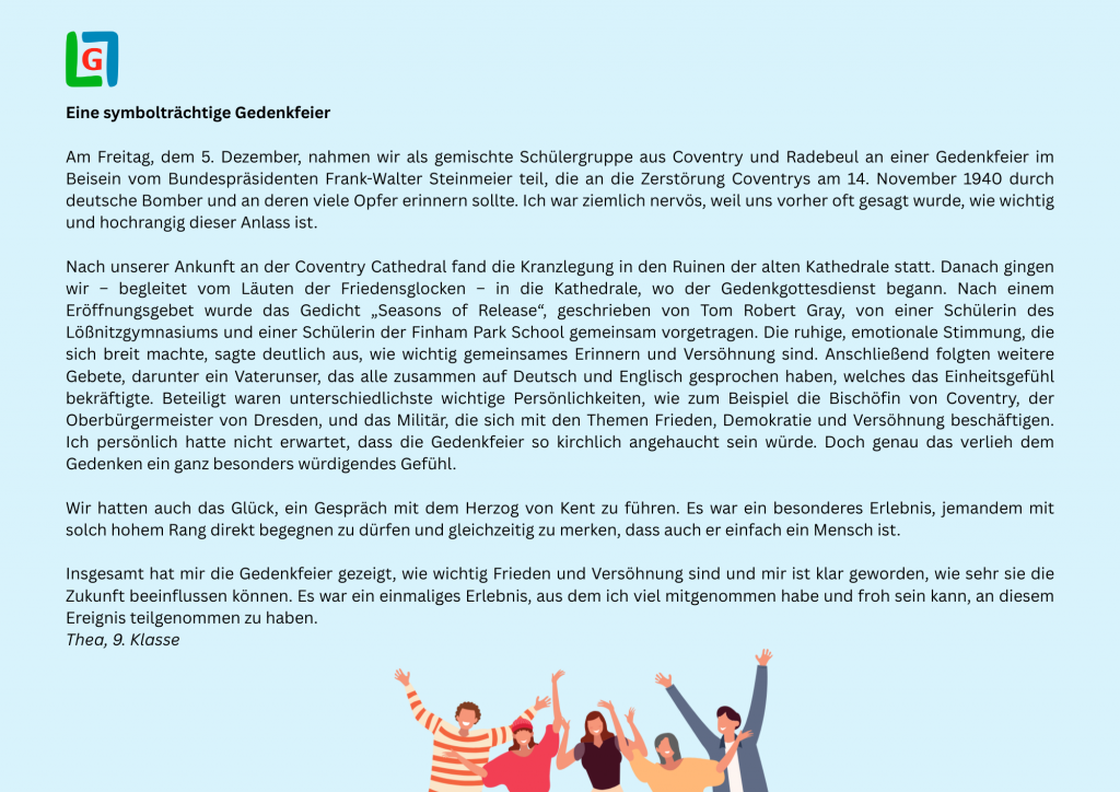 Daher überrascht es nicht, dass Bundespräsident Steinmeier während seines dreitägigen Staatsbesuchs nicht nur den Glanz des königlichen Empfangs in London genoss, sondern auch symbolisch nach Coventry gereist ist, um in den Ruinen der Kathedrale der Opfer der Bombardierungen vom 14. November 1940 zu gedenken und an einer Gedenkfeier gemeinsam mit einer Schulgruppe aus Coventry und einer Schulgruppe aus räumlicher Nähe zu Dresden teilzunehmen. Vier Schüler und vier Schülerinnen aus der Klassenstufe 9 unseres Lößnitzgymnasiums Radebeul waren dabei!