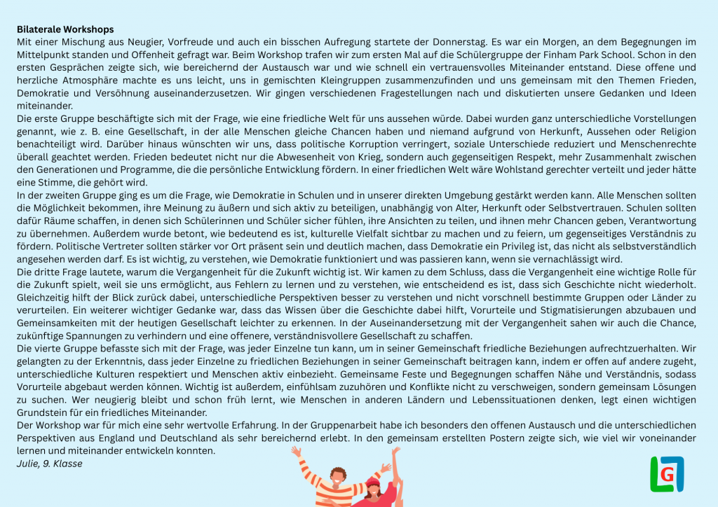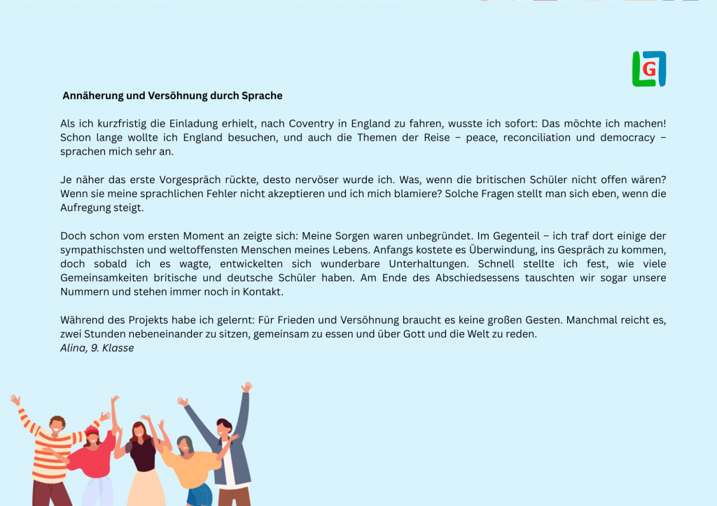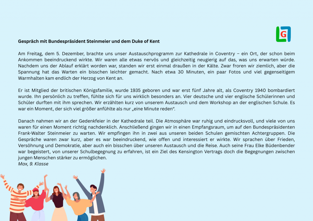 Wie Steinmeier in seiner Rede im britischen Parlament betonte: „Denn am Ende sind es die Menschen, die unsere Freundschaft tragen, nicht die Verträge, nicht die Institutionen. Sondern es sind Deutsche und Briten, die sich kennenlernen, die sich anfreunden, die gemeinsam studieren, arbeiten, leben. Das ist das Fundament unserer Beziehung. Und dieses Fundament wollen wir stärken.“ Lesen Sie die Berichte unserer Schüler und Schülerinnen über ihre außergewöhnliche und geschichtsträchtige Reise nach Coventry!