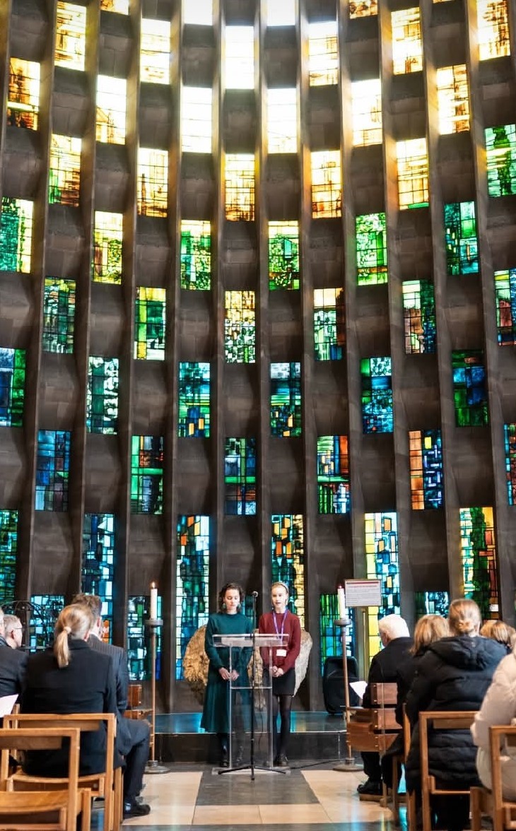 Jeweils acht Schüler und Schülerinnen der Finham Park School Coventry und des Lößnitzgymnasiums Radebeul nahmen an der Kranzniederlegung, einem Gespräch mit dem Herzog von Kent nahe der 2012 von der Stiftung Frauenkirche geschenkten Bronzeskulptur Chor der Überlebenden des Dresdner Bildhauers Helmut Heinze, der Gedenkfeier im 1962 geweihten Kathedrale-Neubau und einem Gespräch mit dem Bundespräsidenten und seiner Frau im Anschluss an die Feier teil. Besondere Highlights für unsere Schüler und Schülerinnen waren der gemeinsame Vortrag des Gedichts Seasons of Release (Tom Robert Gray) durch jeweils eine deutsche und eine britische Schülerin während der Gedenkfeier, und die Chance, dem Bundespräsidenten persönlich von den Ergebnissen der Workshops zu Peace, reconciliation and democracy zu berichten, die am Tag zuvor in der Gastschule Finham Park School Coventry durchgeführt wurden.